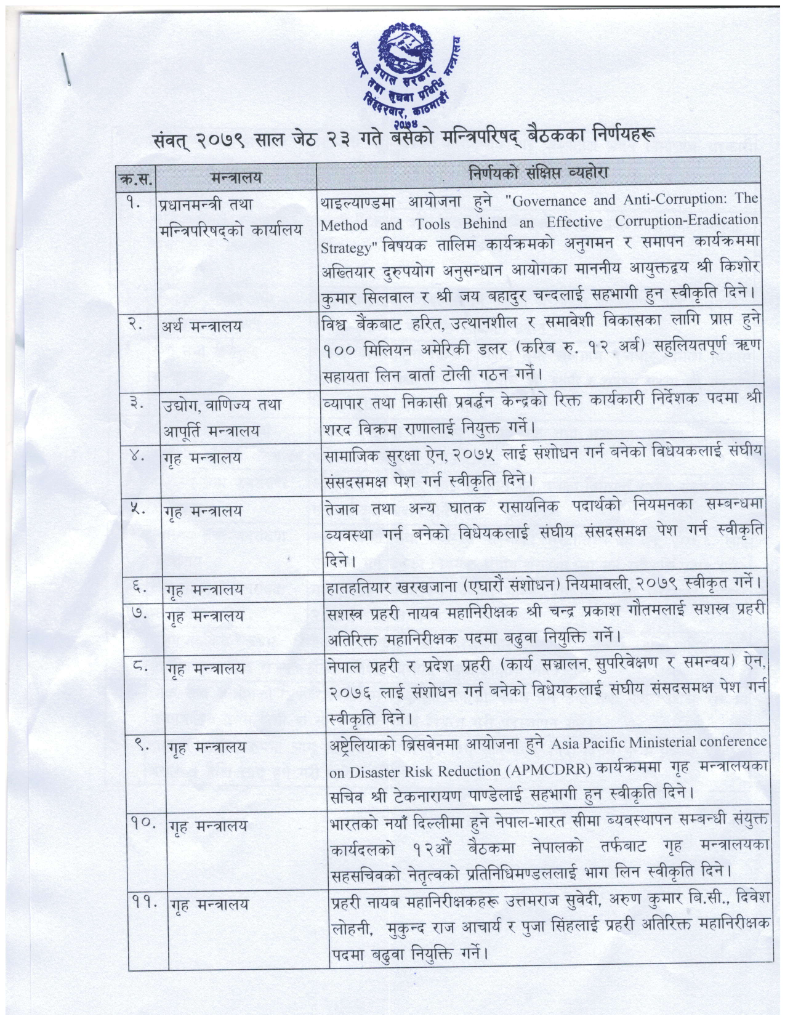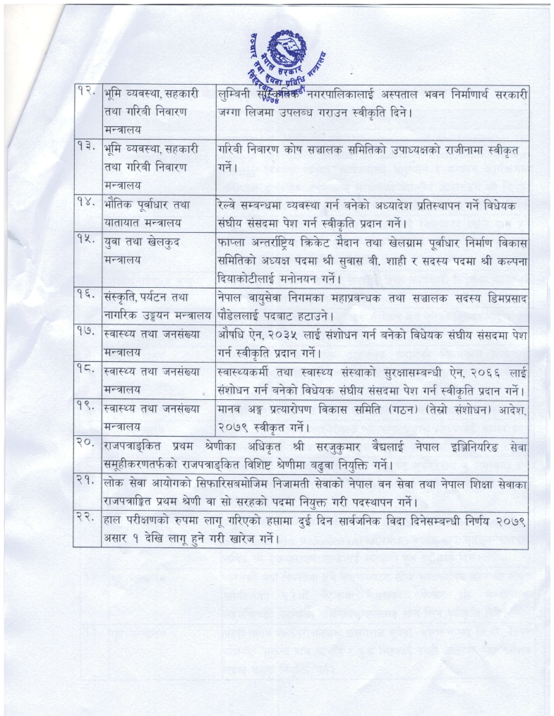 काठमाडौँ – मन्त्रिपरिषद् बैठकका २२ वटा निर्णय सार्वजनिक भएको छ । सोमबार बसेको मन्त्रिपरिषद् बैठकको उक्त निर्णय आज गृहमन्त्री बालकृष्ण खाँणले सार्वजनिक गरेका हुन । सार्वजनिक २२ वटा निर्णयहरु :